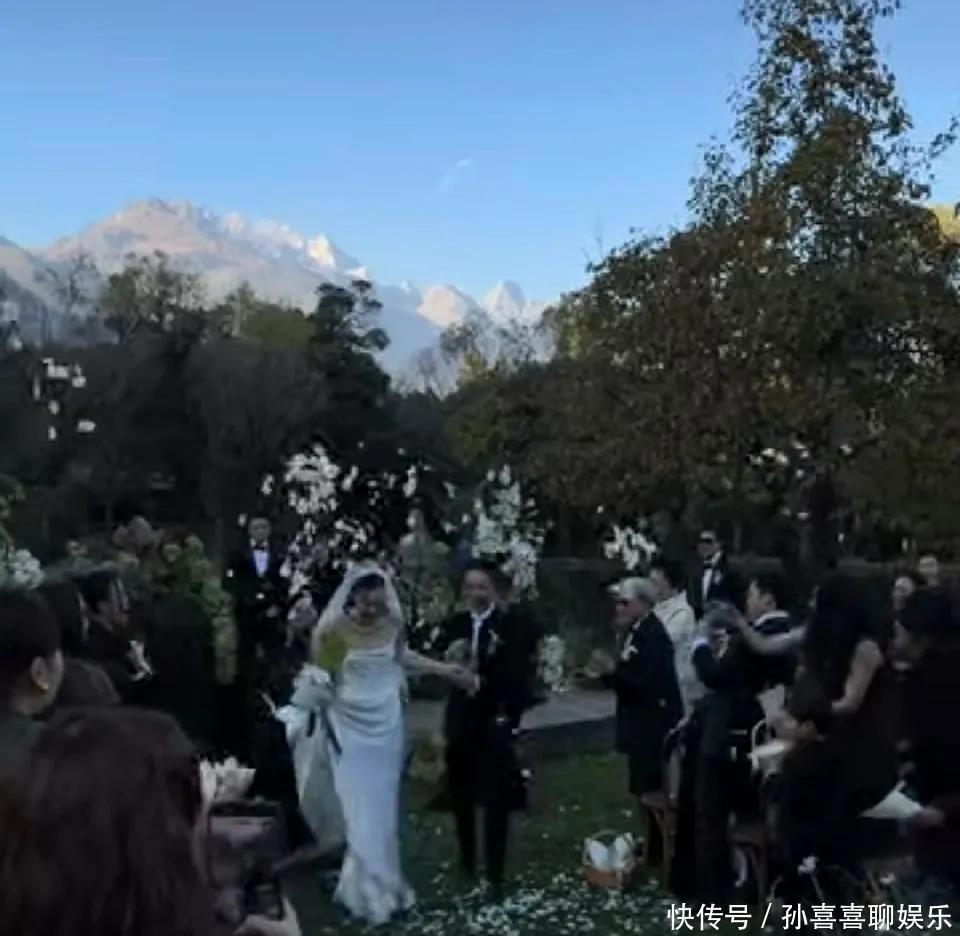 婚礼是在户外举行的,背景就是巍峨的玉龙雪山,前面是一片宽广的绿地。现场布置得既浪漫又温馨,再加上周围那如画的自然景色,别有一番风情,让人感觉心旷神怡。