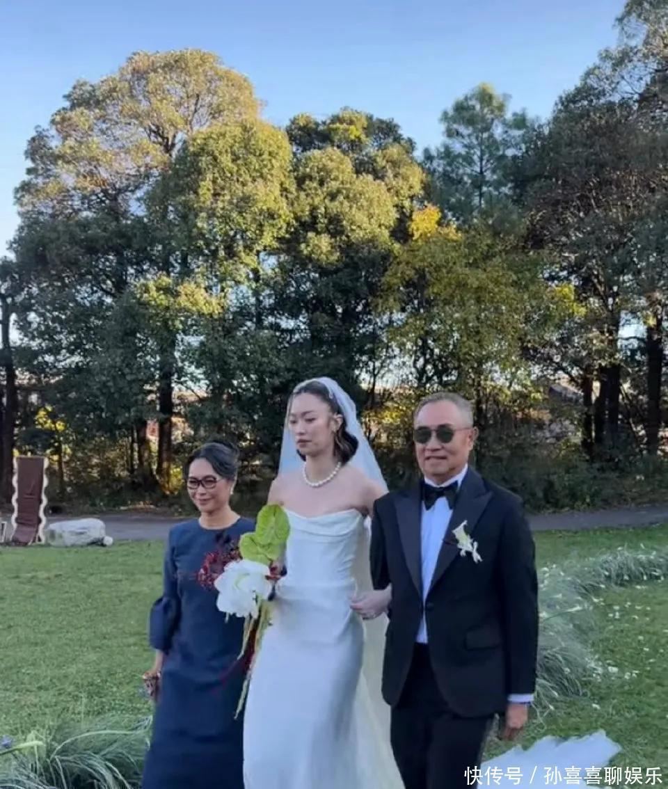 Namfon身穿白色婚纱,配上一条珍珠项链,打扮得干净利落,又简洁大方,显得既美丽又舒适。她由父母陪同走上红毯,家境殷实,显而易见她父母气质挺好,都是文质彬彬的模样,一看就知道家庭条件不差。