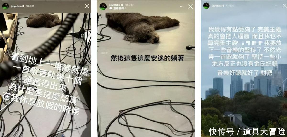 11月17日,周杰伦通过社交平台连续发文,直言“完美主义真的会把人逼疯”,自嘲“不算完美主义只是龟毛(挑剔)”。他表示因过度纠结音乐细节陷入焦虑,甚至看到满地音频线感到烦躁:“一首歌音轨几十个,谁听得出来?为什么在我休息时要这么认真?”配图中展示录音室凌乱的设备线材和数十条音轨工程文件,并晒出宠物狗安逸躺卧的照片调侃:“然后这只这么安逸地躺着”,暗示创作状态紧绷。他最终决定放下部分坚持:“我要放下一些音乐的坚持了,不然光弄一首歌就够了……音乐好听就好了对吧,反正也没有金氏(吉尼斯)纪录。”