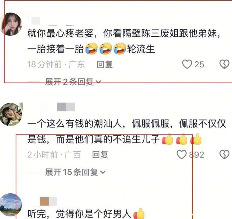 潮汕这边,老规矩多。祠堂祭祀,财产继承,以前都围着儿子转。生不出儿子,女人压力大。现在变点了,年轻人受教育多了。想法不同。郑建鹏这事,算个例子。有潮汕网友留言,说羡慕。自家老人还在催生儿子,要是老公也这样就好了。